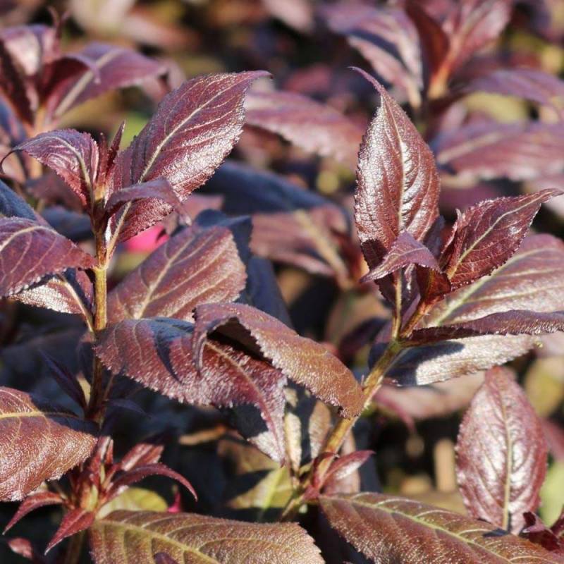 Purple-leaved Weigela, very compact and low maintenance, should be pruned immediately after flowering, removing old and weak branches, favoring young green and smooth ones. It does not exceed 150 cm. The contrast of the striking purple/black foliage with the abundant pink trumpet-shaped flowers make it one of the most showy deciduous shrubs. Adaptable to most locations and also tolerant of shade, where the leaves become more green-bronze.
