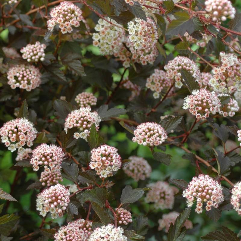 Delightful small-leaved, compact dwarf cultivar. A miniature Physocarpus opulifolius 'Diabolo'. Dark burgundy stems covered with thin, deeply incised dark burgundy-purple leaves with rich green hues on this fully branched dwarf form. The foliage is accented with white button flowers that turn pale pink in spring and summer. A useful compact shrub for small urban gardens, mass plantings or low-maintenance landscaping. Deciduous. The calyxes after the petals have fallen are also very ornamental.