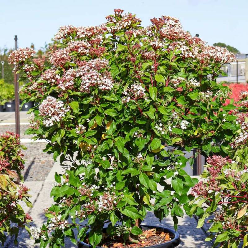 Viburnum tinus 'Eve Price' is a compact, bushy evergreen shrub of medium size, with small, leathery, dense, dark green, oval-shaped leaves and, from late winter, flattened clusters of deep pink buds that open into small, starry white-pink flowers. Its compactness, smaller leaves, density and bright pink color distinguish it from the species. The berries are a deep metallic blue. It is famous for its resistance to wind exposure, even on the coast, and to drastic pruning, which makes it easy to grow in a hedge, or as a decorative element and single specimen in a pot.