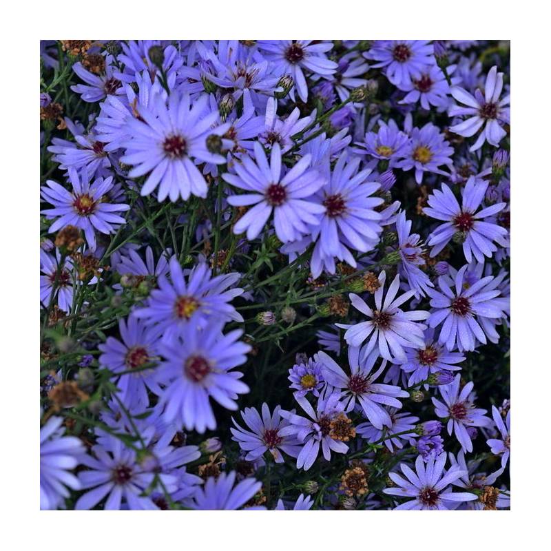 Aster 'Treffpunkt', considered the most floriferous of the asters, produces numerous, compact inflorescences of a vibrant bluish-purple color from early summer through fall. A hardy perennial, it prefers sunny or partial shade locations and well-drained soil. Perfect for borders and flowerbeds, its extraordinary abundance of flowers transforms the garden into an explosion of color.