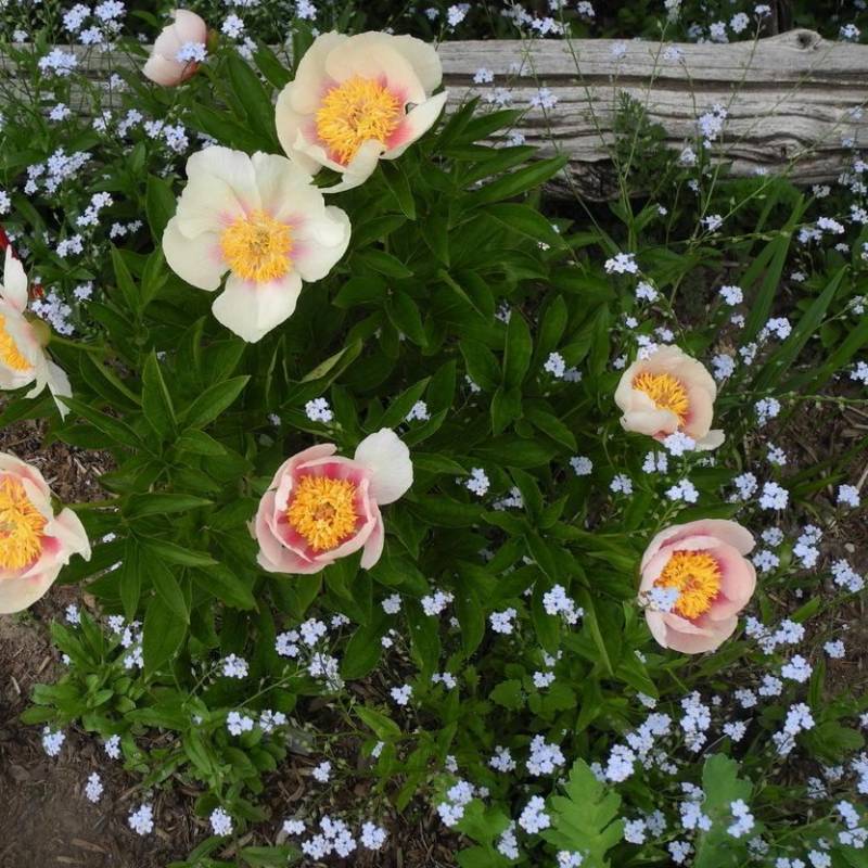 Masterpiece in the group of herbaceous hybrid peonies. Paeonia 'Athena' has single, ivory white or pinkish petals with prominent dark raspberry pink spots at the base of the petals.