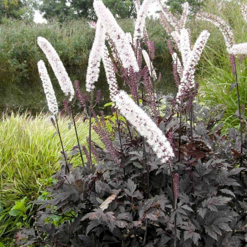 Actaea simplex 'Chocolic' is a spectacular plant, producing thin, slightly scented pink-white foxtail flowers in September and October, above bronze-purple foliage. It is a fantastic plant for a shady part of the garden and provides a valuable source of nectar and pollen for insects. It is perfect for growing in shaded borders and woodland gardens and works well when planted with other ornamental perennials such as hosta, astilbe, hosta, carex, epimedium... It makes an excellent cut flower.