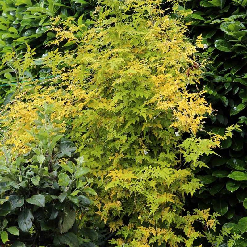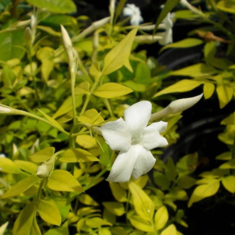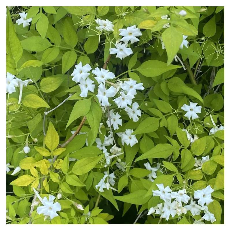 Gorgeous golden foliage covers the twining branches of Jasminum officinale 'Fiona Sunrise'. The leaves open to a chartreuse green and gradually mature to a brilliant gold by autumn. Throughout the summer, a profusion of ivory-white flowers fill the air with a rich fragrance, attracting bees and other pollinators to the garden. Although it will tolerate some shade, this vigorous golden jasmine will produce its best colours and most abundant blooms if grown in a sunny spot, on a trellis or along a fence or wall.